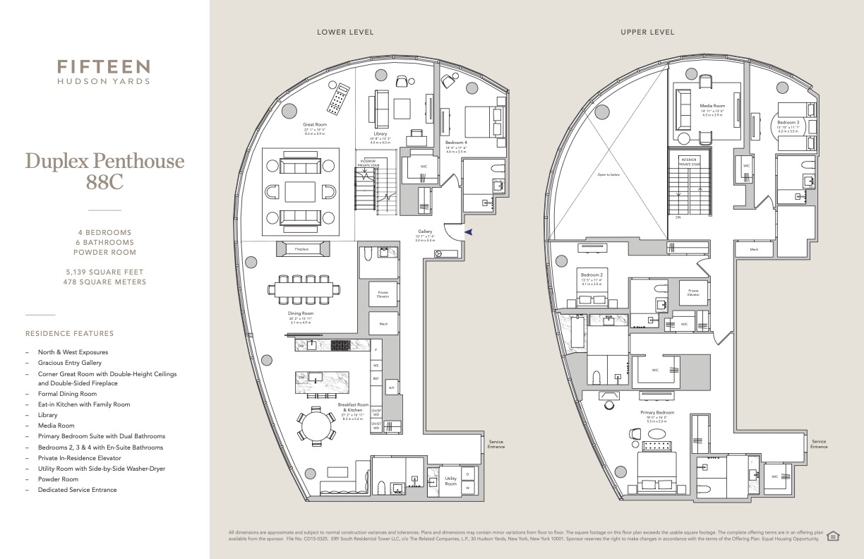 Penthouse 88C is a spacious four bedroom residence of 5137 square feet with ceilings up to 10'10", and spectacular skyline views. The spacious corner great room measures over 670 square feet with an adjacent windowed eat-in kitchen with wood cabinetry and Miele appliances including a steam oven and wine storage. The master bedroom suite offers two large walk-in closets and a luxurious windowed master bath. Bedrooms 2, 3 and 4 have en-suite baths and generous closet space. An elegant entry foyer, utility room with side-by-side washer dryer, separate service entrance, and a powder room for guests make this a truly amazing home.